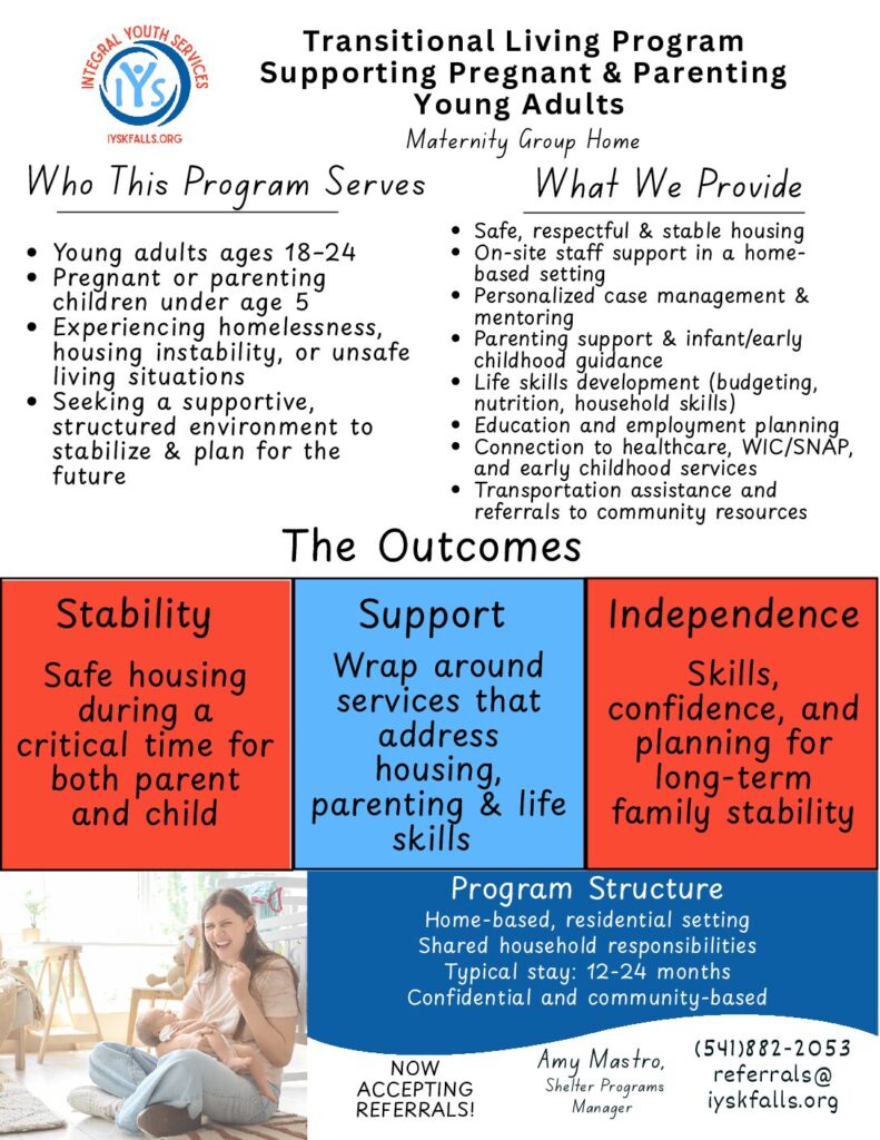The Maternity Group Home (MGH) at Integral Youth Services provides safe, supportive housing for pregnant and parenting young adults ages 18–24 who are experiencing homelessness, housing instability, or unsafe living situations.